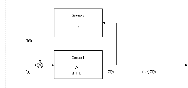 Капиталовложения слагаются из централизованных средств I(t) и отчислений от дохода U(t). Предположим, что отчисления регламентируются нормативом a < 1. Тогда функциональную структуру развития предприятия можно представить в виде модели с положительной обратной связью, состоящей из двух звеньев. Усилительное звено 2 отражает процесс выделения собственных капиталовложений при нормативе отчислений от объема реализации продукции a. Вместе с централизованными капиталовложениями собственные средства воздействуют на звено производства 1, изменяя стоимость ОПФ и объем дохода от реализации продукции X(t) в видединамической производственной функции.
