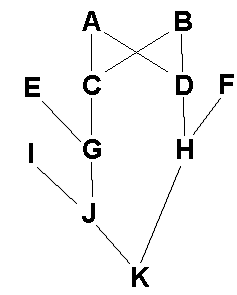 Согласно диаграмме A и B общие предки для родителей J и H особи K. Имеются два замкнутых пути K -J -G -C -A -D -H -K и K -J -G -C -B -D -H -K, каждый из которых состоит из 7 звеньев. Соответственно