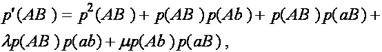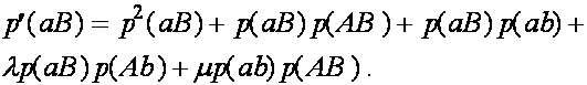 Дадим комментарии к правой части первой формулы (остальные формулы выписываются аналогично). Первое слагаемое - частота генотипа (AB)(AB). При мейозе каждая особь данного генотипа с единичной вероятность порождает гаметы (AB). Второе слагаемое - половинная частота генотипа (AB)(Ab). В силу сделанного выше замечания, несмотря на кроссиговер, каждая особь этого генотипа с вероятностью