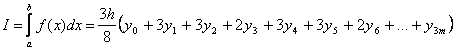 Если же количество отрезков разбиения - нечетное, то для первых трех отрезков следует применить формулу, использующую параболу третьей степени, проходящую через четыре первые точки, для аппроксимации подынтегральной функции.