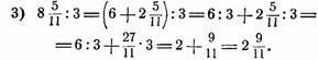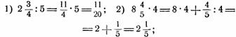 При изучении деления смешанного числа на целое тоже следует разобрать с учащимися два способа выполнения действия, при первом способе смешанное число обращается в неправильную дробь и производится деление дроби на целое число, при втором - применяется распределительный закон деления относительно суммы и делится отдельно целая и дробная часть смешанного числа (предварительна устанавливается справедливость применяемого закона деления). Например.