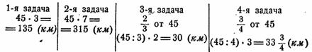 Условие всех задач одинаково. Дана скорость автомобиля в час и требуется узнать, какое расстояние автомобиль пройдет за некоторое число часов. Для нахождения расстояния в 1-й и 2-й задаче скорость умножали на время. Чтобы одинаковые по смыслу задачи решались одинаковыми действиями, условились и в 3-й и в 4-й задаче называть нахождение