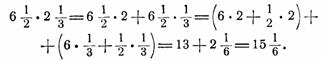 При рассмотрении умножения смешанных чисел обычный прием путем обращения смешанных чисел в неправильные дроби не вызывает затруднения. Следует обратить внимание на другой способ умножения смешанных чисел — умножение по частям, отдельно на целое число и на дробь. Этот способ удобен в некоторых случаях при устном счете.