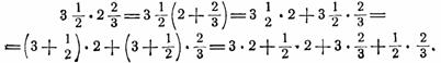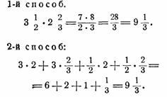 Следует подчеркнуть учащимся, что совпадение произведений, полученных 1-м и 2-м способами, показывает на справедливость распределительного закона и в том случае, когда оба сомножителя — смешанные числа.