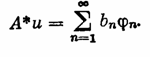Известно, что А*А — самосопряженный положительный вполне непрерывный оператор из F в F. Пусть l1>=l2>=…>=ln>=… — полная система его собственных значений, a j1, j2,…, jn,…—отвечающая им полная ортонормированная система его собственных элементов (функций, векторов). Элемент А*и можно представить в виде ряда