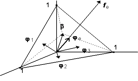 fe - вектор выходных сигналов детекторов, отвечающий излучению e(×), je - его цвет; j1,j2,j3, - векторы (цвета) базовых излучений, b - белый цвет, конец вектора b находится на пересечении биссектрис.