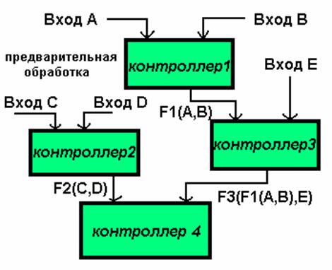 Исходя из этих причин, Steven Goodridge предлагает использовать систему, обрабатывающую большие данные с помощью нескольких нечетких микроконтроллеров, объединенных вместе. Этот подход позволяет качественно управлять трудно описываемыми нечеткими процессами. Каждый элемент, получившейся нечеткой сети обозначается как нечеткий узел. Теперь, если связать выход одного узла со входом другого, все вычисления заметно упрощаются. Этот подход назван нечетким предвычислением (рис.2.4.).