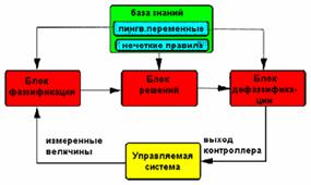 Блок фаззификации преобразует четкие (сrisp) величины, измеренные на выходе объекта управления, в нечеткие величины, описываемые лингвистическими переменными в базе знаний.