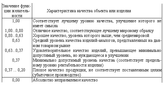С помощью шкалы желательности оцениваются параметры объектов или изделий с точки зрения их пригодности к использованию, или желательности, по отношению к какому-либо практическому применению. Каждому фактическому значению функции желательности придается конкретный экономический смысл, связанный с уровнем конкурентоспособности исследуемого объекта или изделия. Причем значение функции желательности, равное 0, соответствует неприемлемому уровню параметра, при значении которого изделие непригодно для выполнения стоящих перед ним задач; значение функции желательности, равное 1,00, соответствует полностью приемлемому уровню параметра, либо такому значению параметра, при котором дальнейшее улучшение нецелесообразно или невозможно. Промежуточные значения функции желательности, их экономическая характеристика приведены в табл. 1.