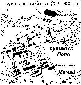 Утром 8 сентября русские переправились через Дон и под прикрытием сторожевого полка развернулись в боевой порядок на Куликовом поле, куда уже подходило войско Мамая. Дмитрий Иванович создал глубокий боевой порядок: в центре стоял большой полк (великокняжеский), правее и левее его - полки правой и левой руки, фланги которых упирались в труднодоступную для действий монголо-татарской конницы местность. Впереди главных сил были расположены сторожевой и передовой полки.Сторожевой полк имел задачу завязать сражение, передовой полк - принять на себя первый удар конницы противника и расстроить ее боевые порядки. Оба полка должны были ослабить силу вражеского удара по главным силам. За большим полком был расположен частный резерв (конница). Кроме того, из отборной конницы был создан сильный засадный полк под командованием опытных военачальников - воеводы Дмитрия Боброка-Волынского и серпуховского князя Владимира Андреевича. Этот полк выполнял задачу общего резерва и был скрытно расположен в лесу за левым флангом главных сил.