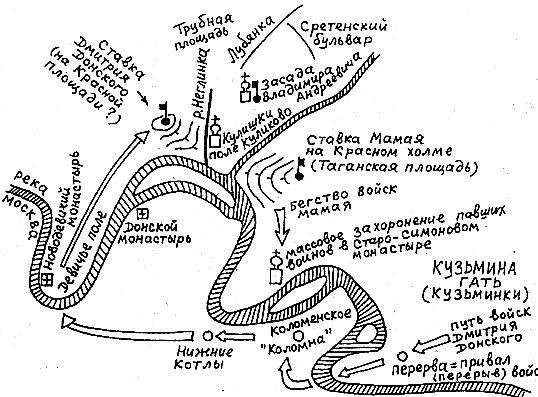На рис. мы попытались восстановить подлинную географию и схему Куликовской битвы на территории Москвы.