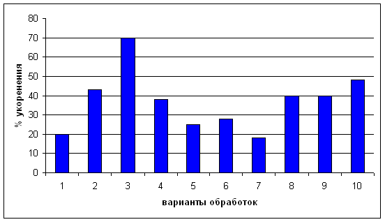 Рисунок 3. Влияние внекорневых обработок зелёных черенков крыжовника (сорт Садко) регуляторами роста на укореняемость.