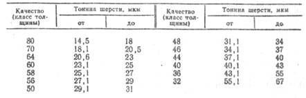 Тонина шерсти — одно из важнейших ее свойств. Под тониной понимают поперечное сечение, или диаметр ее волокон в микрометрах (мкм). Широко распространено также определение тонины шерсти по качествам. Тонина шерсти в значительной степени влияет на толщину пряжи и качество изделий. Согласно советской классификации тонины шерсти установлено 13 основных классов (качеств) шерсти (см табл.).