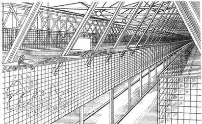 При комбинированном способе птичник разделен на секции, в которых 60% площади занято сеткой и 40% —глубокой подстилкой.