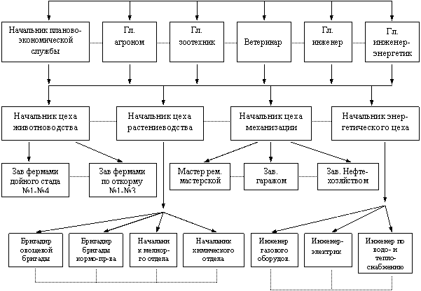 В хозяйстве, как уже говорилось, получил развитие отраслевой принцип организации производства и управления, при котором одинаковые по специализации внутрихозяйственные подразделения, выполняющие работы по производству одного продукта или части его, независимо от территориального расположения, объединяются в одном вторичном внутрихозяйственном подразделении - цехе. Соответственно структура управления называется цеховой или отраслевой.