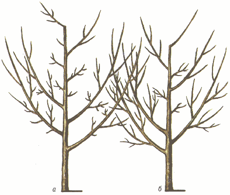 Обрезка запущенных деревьев Деревья необходимо обрезать систематически. Запущенные густые и высокие деревья (5 - 6 м) нужно приводить в порядок в течение 2 - 3 лет. Прежде всего проводят обрезку на снижение кроны. Для этого вырезают часть центрального проводника или замещающей его ветви. Место обрезки в каждом конкретном случае определяют отдельно, но высота дерева должна составлять не менее 3 - 3,5 м. Ветви, расположенные в верхней части кроны, обрезают на перевод на удачно расположенную ветку. В этот же год можно удалить поломанные, сухие, больные, трущиеся и пересекающиеся, а также сильно обвисшие ветки. Основательное прореживание лучше отложить на следующий год. После прореживания, если в этом возникает необходимость, проводят омолаживающую обрезку веток, прекративших рост. В местах обрезки образуется много жировых побегов (волчков). Часть волчков необходимо своевременно удалить. Другую часть можно оставить для формирования плодовых веток взамен подлежащих вырезке. Определённое количество волчков, появившихся на оголённых частях веток, можно оставить для формирования обрастающей древесины. Для этого с помощью сгибания и подвязки их приводят в горизонтальное или пониклое положение. Затем волчки своевременно прищипывают, а через 1 - 2 года обрезают на удачно направленную боковую веточку. Нужно использовать все средства, применить все способы для перевода части волчков на плодоношение. У невысоких запущенных деревьев крону не снижают. Ее хорошо прореживают, оставшиеся скелетные, полускелетные и обрастающие ветви омолаживают. Ветки в зависимости от состояния дерева укорачивают на 1/3 или 1/2 длины. Если дерево молодое, ограничиваются лишь прореживанием, направлением роста ветвей в нужную сторону и восстановлением необходимого соподчинения в развитии веток. Особое внимание обращают на устранение острых развилок. При удалении веток необходимо избегать нанесения нескольких крупных ран на одном уровне с разных сторон ствола или ветви. Волчки около крупных ран для лучшего их заживления в первый год не вырезают.