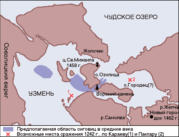 Для места генеральной битвы летописи дают достаточно точные указания, но их интерпретация представляет нелегкую задачу, так как исчезли упоминаемые в летописях географические названия. Из-за этого существует больше десятка локализаций Ледового побоища в различных местах на юге Чудского озера, а также на Теплом и Псковском озерах, как у русского, так и у эстонского берегов. Наиболее существенные приведены на Рис. 9 .