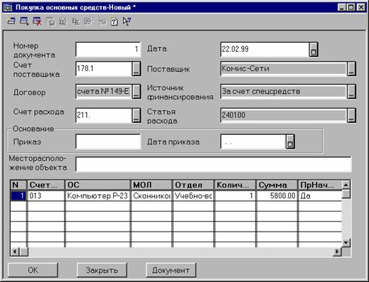Заполнив необходимые реквизиты, следует нажать кнопку «ОК» для сохранения их в карточке и нажатием клавиши Enter (или двойным нажатием правой клавиши мыши) внесите основное средство в документ.