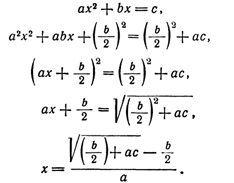 В индии пришли к более простому способу вывода, который встречается в школьных учебниках: они умножали на 4a и к обеим половинам по b2. Это даёт: