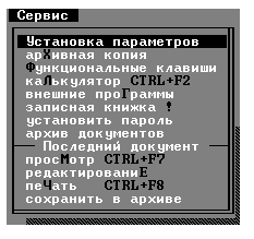 - в ниспадающем меню подвести световой курсор к нужной функции клавишами "" и “¯" и нажать клавишу Enter. Вместо выбора функции клавишами "" и “¯" можно нажать клавишу с буквой, выделенной другим цветом.
