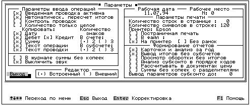 Для выбора устанавливаемого параметра используются клавиши управления курсором. Для установки параметра следует нажать клавишу Enter. Если параметр имеет только два значения “Да” или “Нет” ( против названия параметра стоят квадратные скобки), то текущее значение меняется на противоположное. При этом значение "Да" отображается значением "X", "Нет" - пробелом. Для других параметров предлагается ввести новое значение. Для выхода из ре жима нажать клавишу Esc.