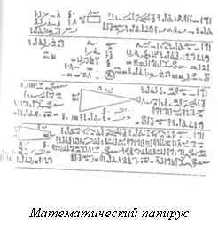 Источником большей части наших сведений об египетской математике являются два математических папируса. Один из них — это уже упомянутый папирус Райнда, содержащий 84 задачи, второй — так называемый московский папирус, который, может быть, на два столетия старше и содержит 25 задач. Эти задачи были уже достаточно стары, когда составлялись папирусы, но есть меньшие папирусы значительно более позднего происхождения, даже римских времен, которые не отличаются от названных по своим приемам. Математика, которая в них изложена, основана на десятичной системе счисления со специальными знаками для каждой десятичной единицы более высокого разряда — системе, которая нам знакома благодаря римским обозначениям, основанным на том же принципе: МDСССLХХVIII,= 1878. На основе такой системы египтяне построили арифметику преимущественно аддитивного характера, т. е. ее основное направление состоит в сведении всех умножений к повторным сложениям. Например, умножение на 13 получается умножением сначала на 2, затем на 4, затем на 8 и сложением результатов умножения на 4 и на 8 с первоначальным числом: