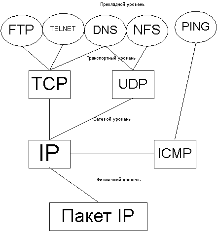 Если говорить строго, то TCP/IP - это стек протоколов, включающий TCP, IP, UDP (User Datagram Protocol), ICMP (Internet Control Message Protocol), и ряд других протоколов. Стек протоколов TCP/IP не соответствует модели взаимодействия открытых систем (ВОС), и его структура показана на рисунке 1.1