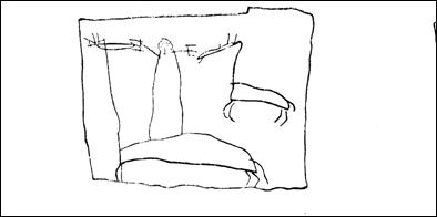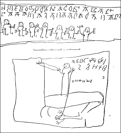 Следующая грамота №200 почти целиком заполнена рисунком маленького художника, уже знакомого нам своей “творческой манерой”. Маленький художник мечтал о доблести и о подвигах. Он изобразил некое подобие лошади и всадника на ней, который копьём поражает брошенного под копыта лошади врага. Около фигуры всадника помещена пояснительная надпись: “Онфиме”. Мальчик Онфиме нарисовал свой “героический автопортрет”.