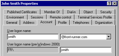 Когда пользователь входит в домен, расположенный в Active Directory, у него может быть два типа имени. Первое из них – традиционное NetBIOS -имя. В Windows 2000 на него ссылаются как на downlevel logon name (имя регистрации в ранних версиях Windows). Этот тип имени существует для совместимости с ранними версиями Windows, процесс входа в которые был основан на использовании имен NetBIOS (такие OS как NT 4, Windows 9x и так далее). Когда вы используете downlevel logon name (на вкладке свойств –«имя входа пользователя пред-Windows 2000») для входа, пользователь должен ввести имя пользователя, пароль и выбрать соответствующий домен, в который он собирается входить. Второе имя – и это новинка в Windows 2000 – это возможность входа в систему с использованием того, что называется User Principal Name (основное имя пользователя) или UPN. Основное имя пользователя имеет следующий формат – user@domain.com (на вкладке свойств пользователя это называется – User logon name (имя входа пользователя)). Если это соглашение действует, то пользователю не нужно определять домен, в который он хочет войти. Фактически, когда для входа в Windows 2000используется UPN, доменная часть окна имени для входа в систему закрашена серым. Пример этих двух типов имен показан на вкладке свойств учетной записи пользователя Active Directory: