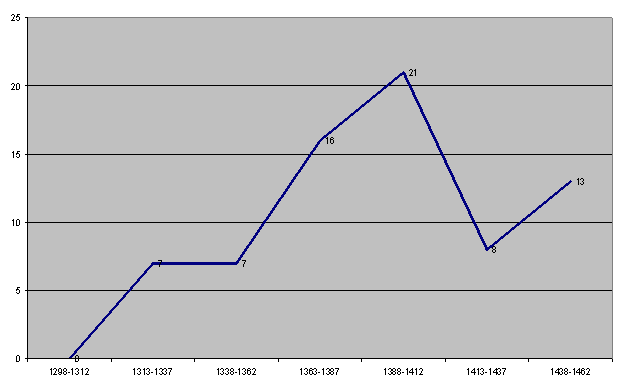 После Куликовской битвой и нашествия Тохтамыша на Руси еще четверть столетия была мирная жизнь. В этот период отмечается значительный рост каменного строительства (см. рис. 2)