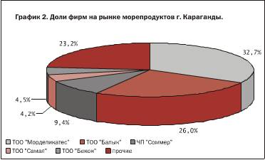 Доля рынка ТОО "Балык" составляет 26%, ЧП "Соммер" - 9,4%, ТОО "Самал" - 4,2% и ТОО "Бекон" - 4,5% (График 2.).