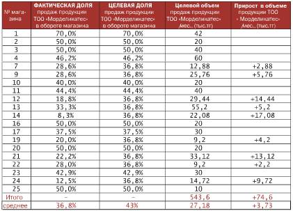 Разработка соответствующих стимулирующих программ и мероприятий поддержки позволит добиться увеличения доли продукции ТОО "Морделикатес"в обороте магазинов, в которых он значительно ниже - например, до уровня 36,8 %, а следовательно доля рынка ТОО "Морделикатес" соответственно увеличится на 5,5% и составит 38,2% (Таблица 2.).
