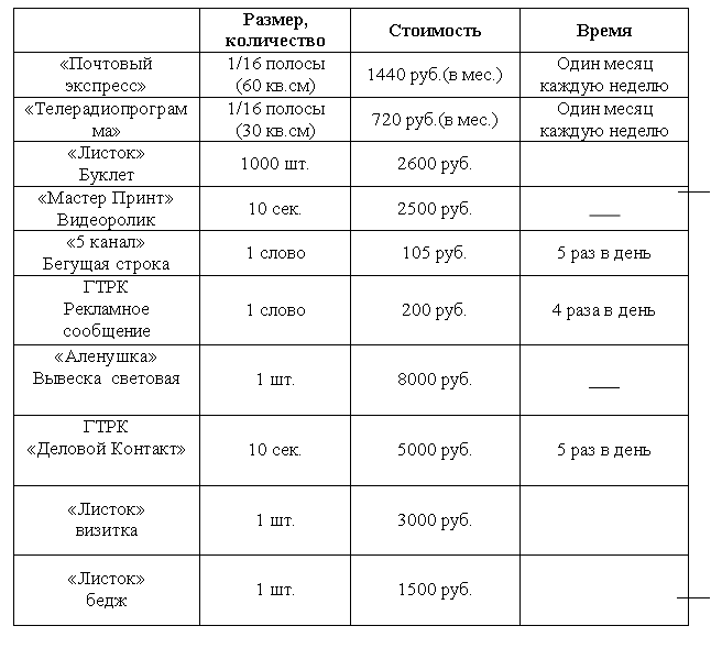 Стоимость рекламы в “Почтовом экспрессе” = 4 раза в месяц * 360руб.(60 кв.см) = 1440 руб.в месяц; Стоимость рекламы в “Телерадиопрограмме” = 4 раза в месяц * 180руб.(30 кв.см) = 720 руб. в месяц; Реклама бегущей строкой на “5 канале” = 1 слово * 10 слов в сообщении * 10руб.50коп. = 105 руб. Реклама на радио (ГТРК) = 1 слово * 20 слов в сообщение * 10 руб. = 200руб. Визитки = 1 шт. * 30 руб. * 100 шт. = 3000 руб. Беджи = 1 шт. * 100 руб. * 15 шт. = 1500 руб.