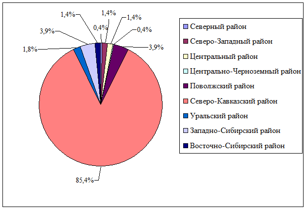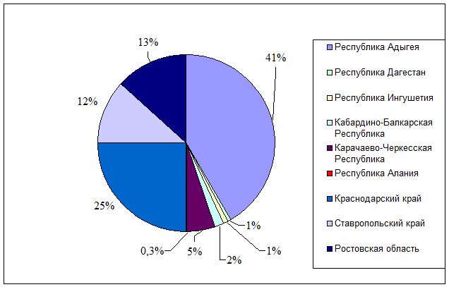 На рисунке 3.2 видно, чо 85,3% продукции фабрики реализуется в Северо-Кавказском регионе. Кроме того, как иллюстрирует рисунок 3.3, 41% и 25% сбыта приходится на Республику Адыгея и Краснодарский край соответвенно.