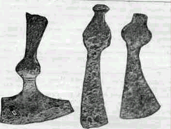 Основная масса наконечников стрел изготовлялась из обычного железа. Иного материала здесь и не требовалось. Для разового применения стрелы стойкость железного наклепанного лезвия была вполне достаточна, а о том, что в стрелах применялся холодный наклеп острия, свидетельствует структура наконечника из Гнездовских могильников. Микрошлиф обнаружил на ферритной структуре линии сдвигов, характерные для металла, подвергшегося сильному холодному наклепу. Специальный тип боевых стрел - бронебойные - изготовлялись из стали или железа с последующей цементацией. Бронебойные стрелы подвергались термической обработке. О закалке стрел свидетельствуют и некоторые литературные источники. В "Слове о полку Игореве" есть такое место: "С вечера до света летят стрелы каленые". То, что наконечники боевых стрел термически обрабатывались, видно на стрелах с Княжей Горы. Из механических операций, применявшихся при производстве стрел, наиболее интересны операции с применением обжимок и штампов. Многие стрелы при переходе лезвия в черенок имели фигурные, геометрически точно изготовленные бортики и венчики, сделать которые возможно только обжимкой или штампом. Обращает на себя внимание симметричность лезвий и очень тонкая заточка острия. Такая высокая кузнечная техника изготовления наконечников стрел была возможна лишь при массовом и специализированном их производстве. Встречаются в "Слове о полку Игореве" и "злаченые стрелы". Известны "злаченые стрелы" также и среди археологических материалов. Один наконечник железной стрелы ланцетовидной формы с позолоченной поверхностью был найден на Райковецком городище. Вероятнее всего, золотились парадные стрелы наподобие парадных инкрустированных боевых топориков (Рисунок 9 Боевые топорики.). |