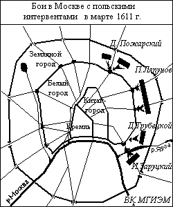 При приближении ополчения к столице в ней 19 марта 1611 года началось восстание, но оно было безжалостно подавлено поляками, превратившими за 2-3 дня город в груду развалин. Земское ополчение 23-24 марта 1611 года окружило Москву. Яростные бои проходили на Сретенке (Д.Пожарский), от Яузских ворот до Трубы (П.Ляпунов), на Воронцовом поле (И.Заруцкий и Д.Трубецкой). В начале апреля штурмом был взят Белый город, а в июле удалось загнать поляков и семибоярщину в Кремль и Китай-город. Попытки поляков снять блокаду к успеху не приводили, но и ополчение не имело сил взять Кремль. В результате вражды вождей ополчения 22 июля 1611 года П.Ляпунов был убит казаками. Основная масса служилых людей покинула Москву, в ней остались только казаки (около 10 тыс.чел.)