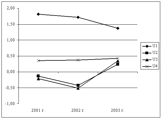 Благоприятную динамику демонстрирует коэффициент соотношения собственных и заемных средств ( U1 ): на 1 рубль собственных средств в конце 2003 г. приходилось 1,37 рубля заемных средств, что выше нормативного значения, но значительно лучше, чем в предыдущие годы.