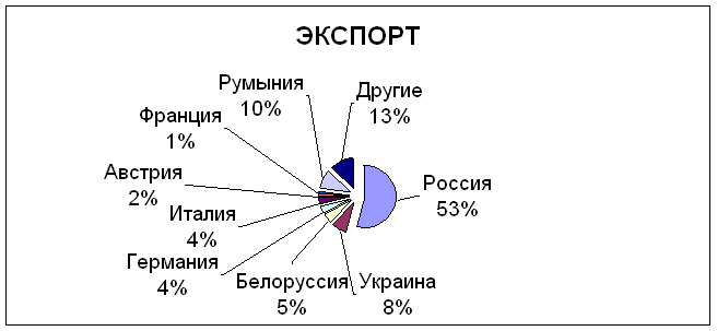 Если рассматривать экспортно-импортные операции в 1998 году с точки зрения географии стран-партнеров, то сохранилась тенденция прошлых лет. В экспорте две трети продукции по-прежнему отправляется в страны СНГ, на долю которых приходится 67,7% от общего объема. При этом удельный вес России составляет 53%, Украины - 7,8% и Белоруссии 5,1%. Нетрудно подсчитать, что торговля с остальными государствами Содружества практически свернута. Из стран Евросоюза больше всего молдавских товаров экспортируется в Германию - 3,8% от общего объема, Италию-3,5%, Австрию -1,5% и Францию -1,3%. В общем же доля стран ЕС в экспорте Молдовы составляет 13,1 %. Из других государств следует выделить Румынию,котораявышла на второе место среди экспортных партнеров Молдовы. На ее долю приходится примерно десятая часть поставок молдавских товаров за