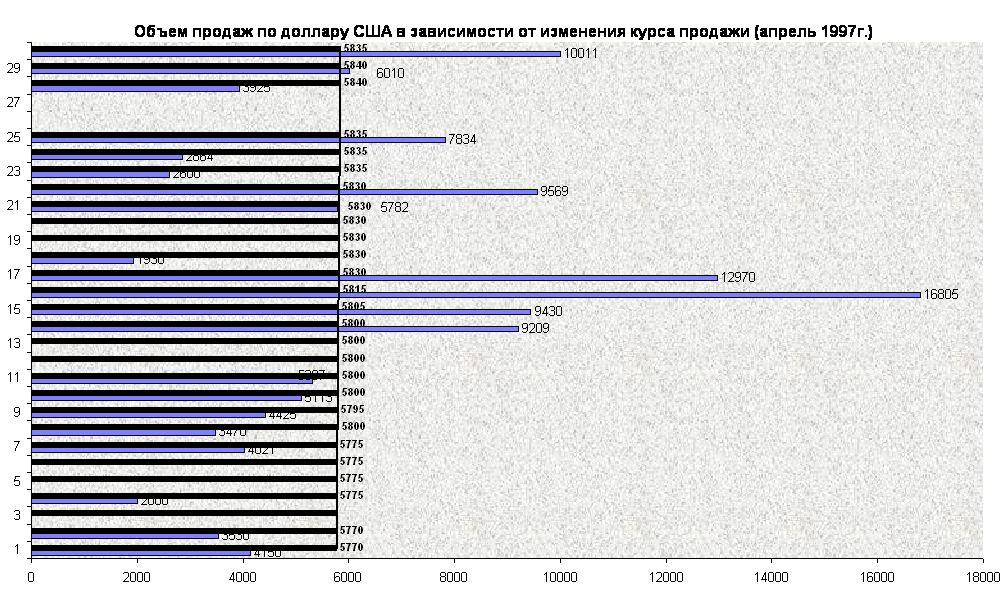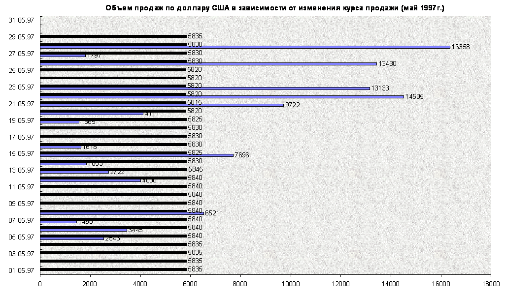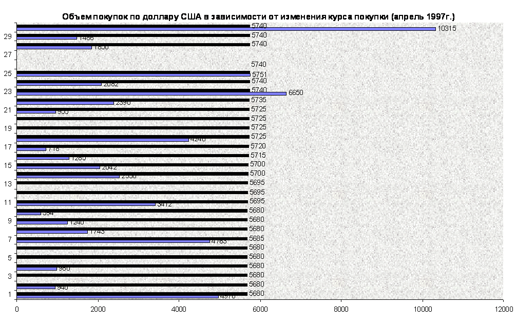 К тому же немаловажное значение на практике имеет то, что значительную роль в зависимости спроса от курса покупки-продажи иностранной валюты для конкретного банка играет только гораздо большая маржа по сравнению с банками конкурентами. При небольших диапазонах изменения банковских курсов в различных обменных пунктах наблюдается несовпадение теоретического вывода о высокой зависимости цены и спроса. Реальная картина, полученная на данных статистического анализа операций обменного пункта Некоторого Астраханского банка и приведенная на графиках подтверждает этот вывод. Объясняется это тем, что иностранная валюта не является предметом первой необходимости, и спрос на нее формируется в основном за счет внешних политических и экономических факторов, значительно возрастая к концу каждого года, оставаясь весьма высоким в начале года. Статистические данные также показывают, что средневзвешенный объем сделки не достигает той величины, когда клиент может получить значительную экономию средств или дополнительный доход, потратив время на поиски обменного пункта с наиболее выгодным курсом.