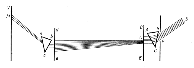 Таким образом, простые лучи являются неизменными. Они представляют, можно сказать, атомы света, подобно атомам вещества. Этот вывод казался в хорошем согласии с корпускулярной теорией света. Действительно, неизменные атомы света, простые лучи, являются потоком и однородных частиц, которые, попадая в наш глаз, вызывают ощущение определенного цвета. Смесь же разнородных световых частиц является белым светом. При прохождении через призму белый свет разлагается. Призма сортирует световые частицы, отклоняя их на разный угол в соответствии с их цветностью.