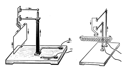 Ампер показал также, что виток с током и спиралевидный проводник с током (соленоид) ведут себя как магниты. Два таких проводника притягиваются и отталкиваются подобно двум магнитным стрелкам.