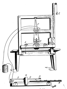 В телеграфе Морзе при замыкании ключа электрический ток поступал в обмотку электромагнита, который притягивал висящий маятник с закрепленным на конце карандашом, При этом конец карандаша касался бумажной ленты, непрерывно передвигающейся с помощью специального механизма в горизонтальном направлении перпендикулярно плоскости качания маятника.