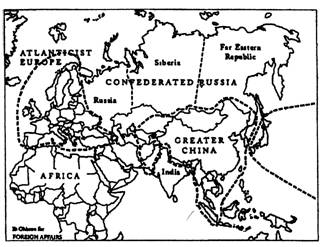 Таким образом, подготавливается почва для расчленения России на семь «удельных княжеств», каждое из которых впоследствии должно подвергнуться дальнейшему разделению. В юбилейном журнале Foreign Affairs за сентябрь-октябрь 1997 года, являющимся печатным Органом Совета по международным отношениям[4], была опубликована карта «новой» России. Ее западная граница проходит по линии между Курском и Петрозаводском, южная - между Ростовом и Волгоградом, восточная — по Уралу. Появляются Дальневосточная и Сибирская республики (без южных регионов, отданных Японии и Китаю). Отторгаются от России Северный Кавказ, Ставропольский и Краснодарский края, Брянская, Смоленская, частично Московская и Тверская, Псковская, Новгородская, Ленинградская области, Карелия и Кольский полуостров. В посвящении журналу Бжезинский написал: «Моим студентам — чтобы помочь им формировать очертания мира завтрашнего дня».