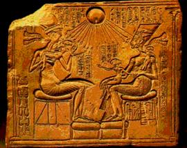Лучшее, что было создано в этот период - скульптурные портреты Эхнатона и его жены Нефертити, выполненные в рельефе и круглой пластике. Впервые в истории египетского искусства появилось изображение фараона в кругу семьи. Солнечный диск бога Атона повсюду простирает к ним свои лучи, благословляя их любовь и деяния. |