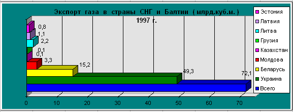 Объём поставки природного газа в Ближнее Зарубежье в 1997 г. сохранился на уровне 1996 г. и составил 72,1 млрд.м3. Однако по некоторым странам наметился рост потребления российского газа: Беларусь - на 11,7%, Молдова - на 3,1%.
