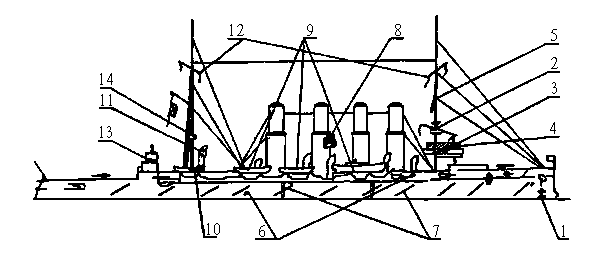 1-сбит c походных креплений становой якорь; 2-сбит фока-рей; 3-сбит боевой прожектор, разрушено крыло мостика; 4-частично уничтожен обвес мостика, выгорела штурманская рубка; 5-перебиты фок-ванты; 6-снарядные пробоины; 7-сбиты шесты противоторпедных сетей, 7-ой вырван c вертлюгом; 8-пробоина в дымовой трубе; 9-осколочные повреждения гребных судов и парового катера; 10-обгоревший шестивесельный вельбот; 11-пробоины вентиляционных раструбов; 12-перебитые брасы реев; 13-обгоревший кормовой мостик; 14-рарушен грот-марс.