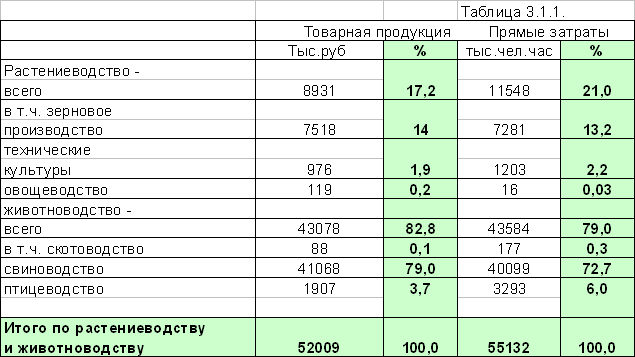 Так, если объем реализации свинины занимает 79% от общего объема, то затраты труда - 72,7% от общей суммы затрат труда, по зерну 14 и 13% соответственно.