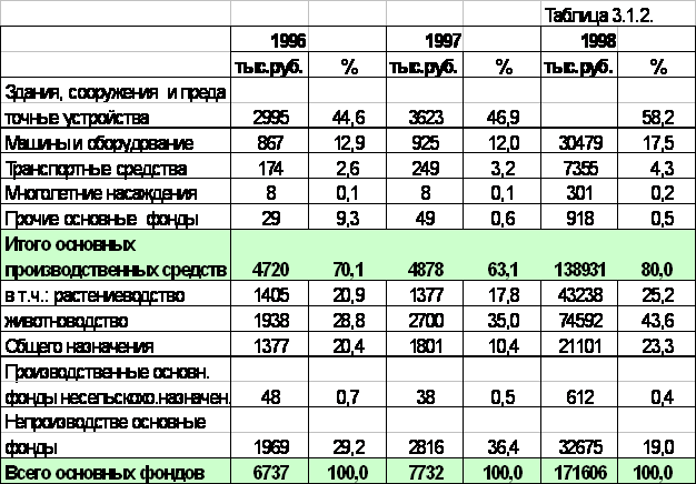 Как явствует из данных, приведенных в таблице 3.1.2. на 1 января хозяйство располагало основными средствами на сумму 171606 тыс.рублей. Наибольшую часть 3/4 от всего имущества занимают основные средства сельскохозяйственного назначения. За последние три года наметилась тенденция к увеличению удельного веса основных средств сельскохозяйственного назначения.