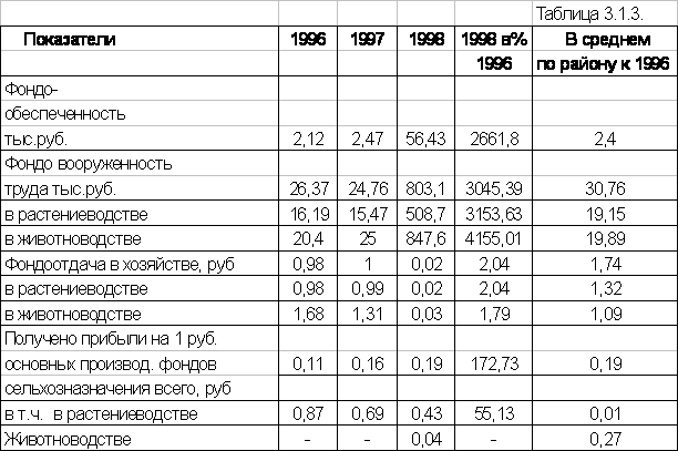 Фондовооруженность труда работников и фондообеспеченность хозяйства в 1998 году значительно возросли, по сравнению с предыдущими годами, в то же время фондоотдача сократилась и составила 0,02.