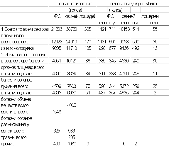В 1997 году (таблица 3.3.1.) зарегистрировано больных животных : крупный рогатый скот - 12765 голов, свиней - 26100 голов, лошадей - 188. В это же время из числа зарегистрированных больных пало и вынуждено убито : крупный рогатый скот, пало - 9,33 % вынуждено убито - 5,57 % ; свиньи - 38,92 % - пало, а вынуждено убито - 1,96 % ; падеж лошадей составил - 29,26 %.